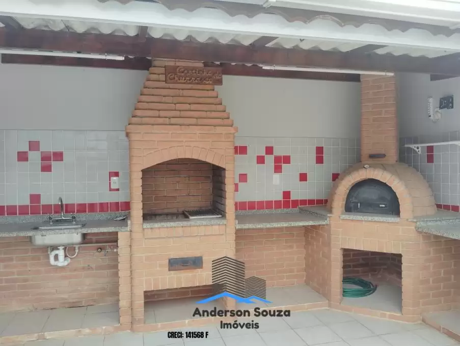 Área gourmet com churrasqueira, forno de pizza e pia toda coberta